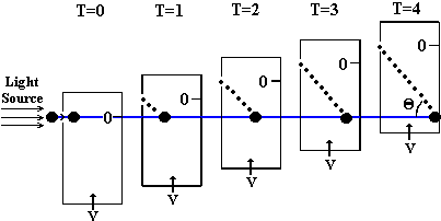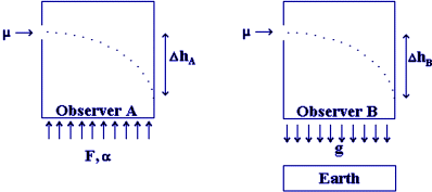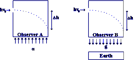 Let us assume that the acceleration due to the rocket produces a change of velocity dv/dt equal to g = 9.8 m/s which is the gravitational acceleration on Earth. Observer A will feel that the upward force of the floor produces the same downward path on the photon as for a massive particle accelerated in the Earth's gravitational field (figures 10.2A and 10.2B).